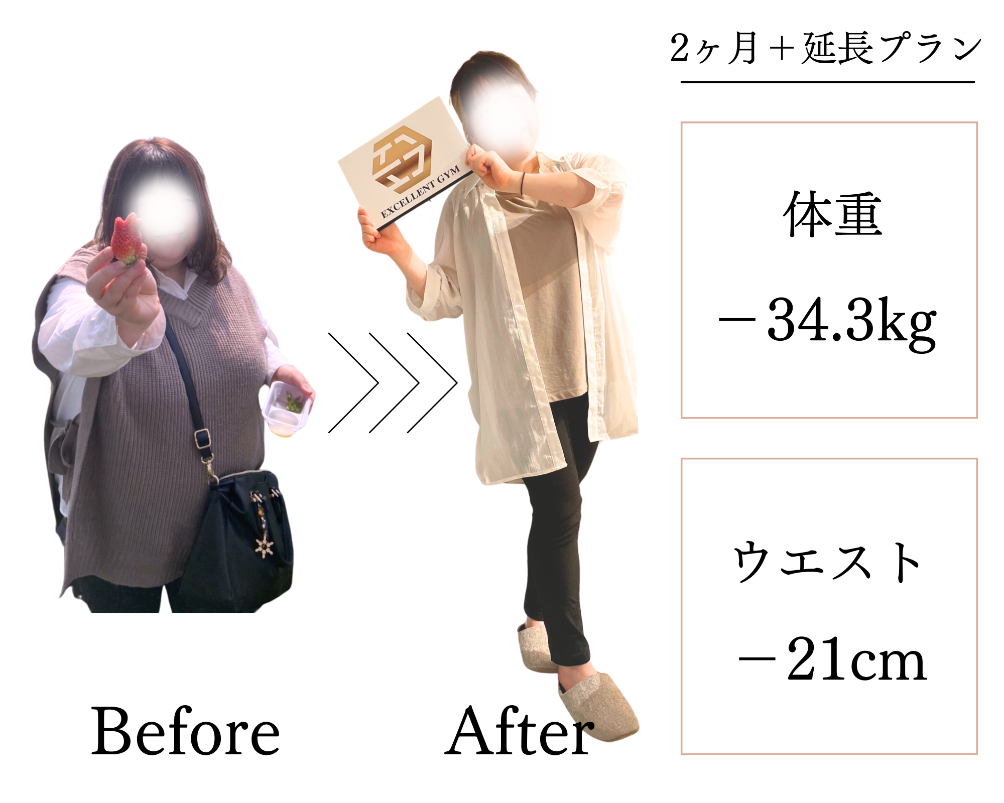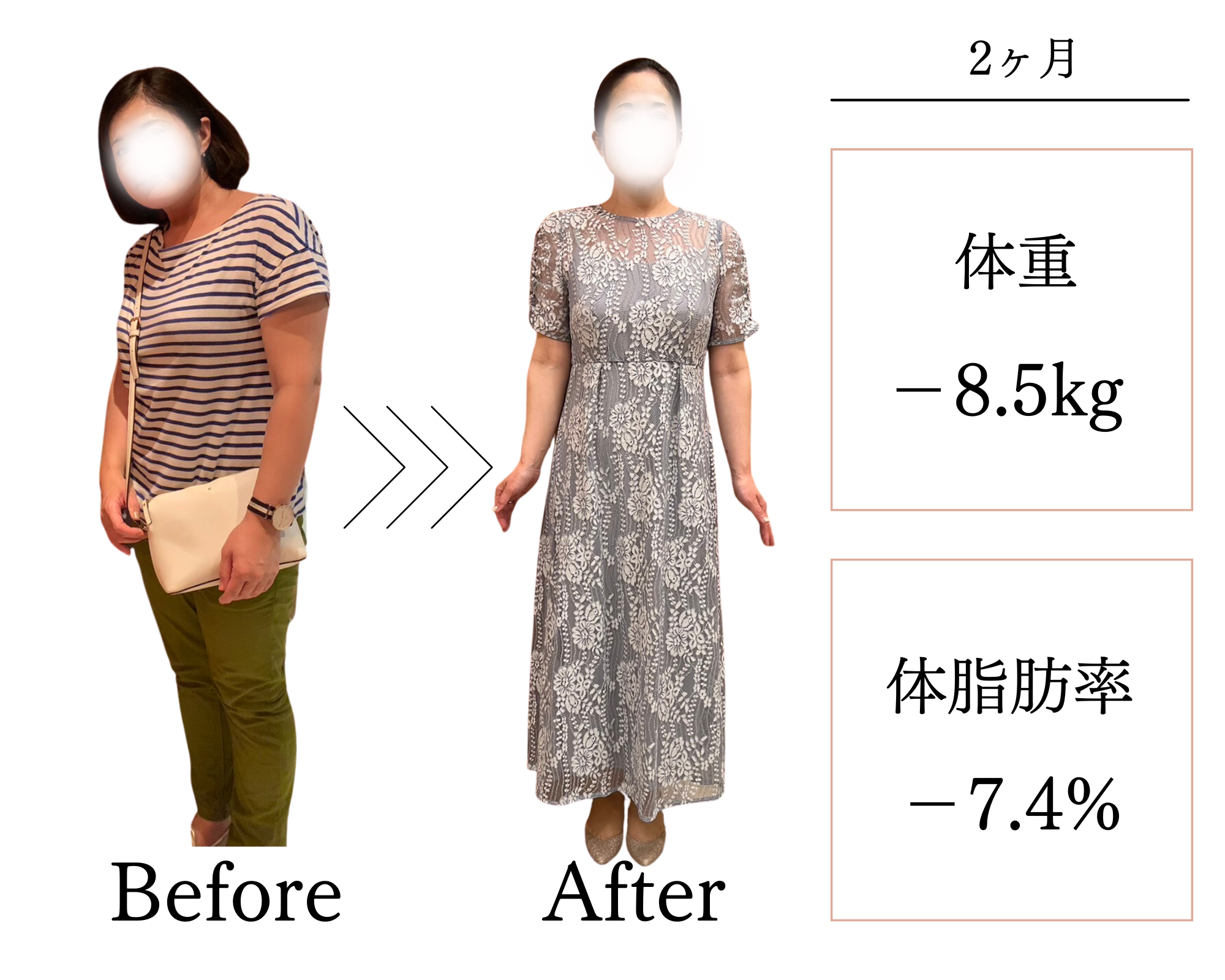 4ヶ月後に控えた友人の結婚式でドレスを着る為に、ダイエットを開始。これまでは無意識に食べることが殆どでした。当ジム入会後、日常の外食の種類や頻度を変更。通勤時以外も歩くことを意識し、ジムではボディラインを綺麗にするトレーニングを行いました。食事と運動を意識的に行ったことで、短期間で成果を出されました。